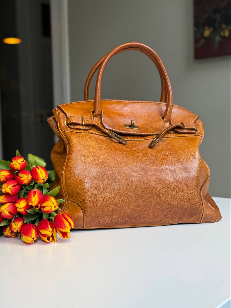 Orange washed leather bag with handmade finished color