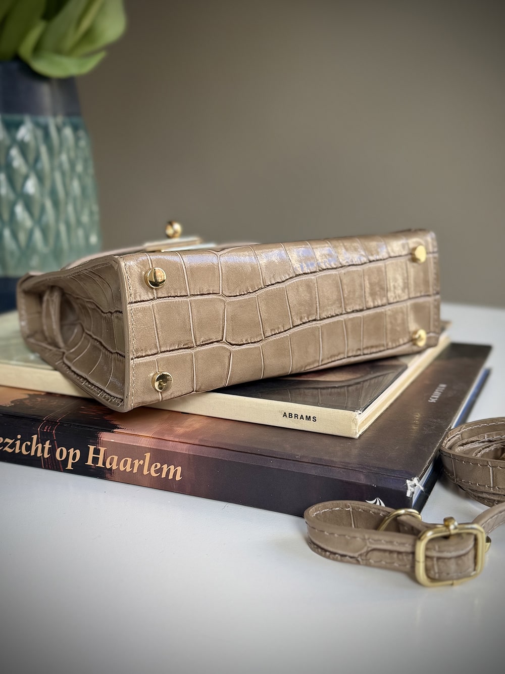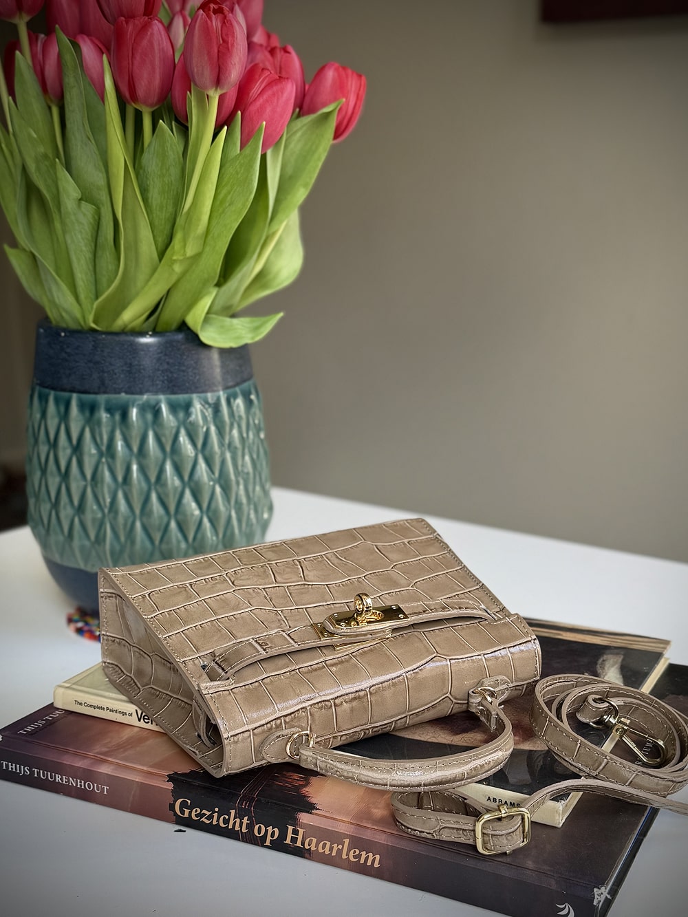 Genuine leather cross-body featuring one main compartment. The interior can be safely closed off with a flap with golden hardware. There is an additional long strap.