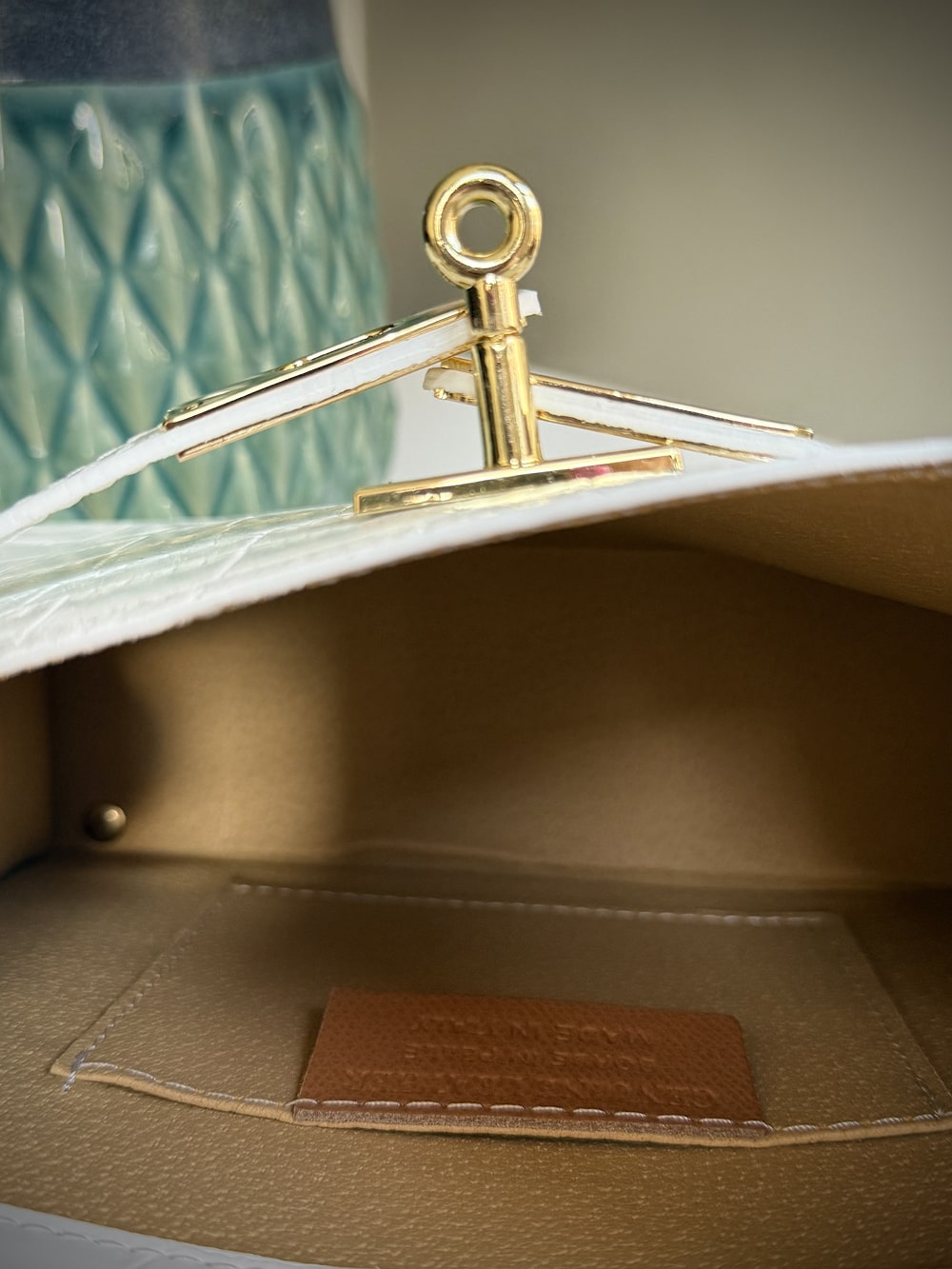 Genuine leather cross-body featuring one main compartment. The interior can be safely closed off with a flap with golden hardware. There is an additional long strap.